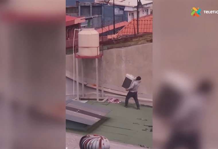 En el video grabado por uno de los vecinos se ve cómo, a plena luz del día, dos sujetos suben a los techos, uno de ellos logra soltar un aire acondicionado y se lo lleva hasta donde está la otra persona, que le ayuda a subir.