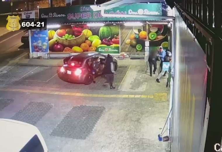 El video de una de las cámaras de seguridad del supermercado El Dragón, en Santa Bárbara de Heredia, muestra el momento cuando los delincuentes ingresan para asaltar el negocio.