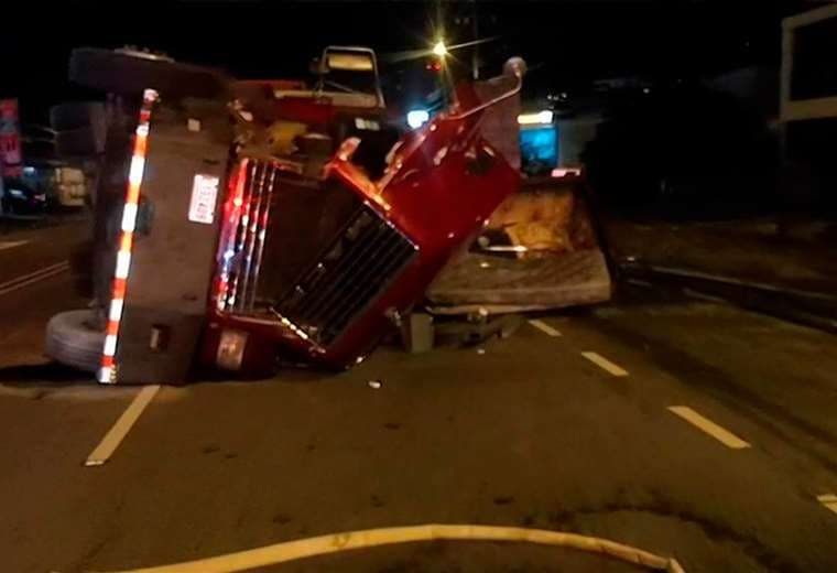 Posteriormente vuelca y todo el material que llevaba cae sobre la vía, lastimando también al transeúnte.