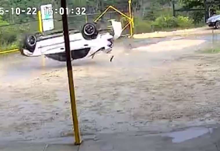 Según un video de seguridad, el vehículo en que viajaban colisionó contra otro carro y, producto del fuerte impacto, salió por los aires hasta caer dentro de una propiedad privada.