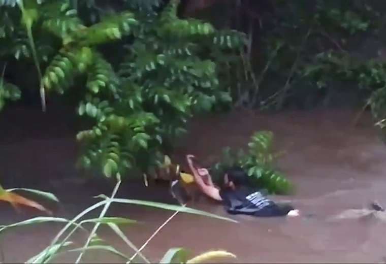 Como se aprecia en el video adjunto, el sujeto se aferró a la rama de un árbol para no ahogarse y los Bomberos tuvieron que realizar una maniobra de rescate.