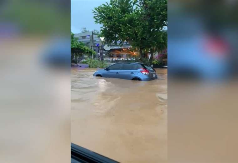 “Ahí está mi carro navegando por el parque de Jacó, en la calle pública, esto se convirtió en un río, hay otro carro completamente tapado”, se escucha decir a una conductora que logró salir de su carro.