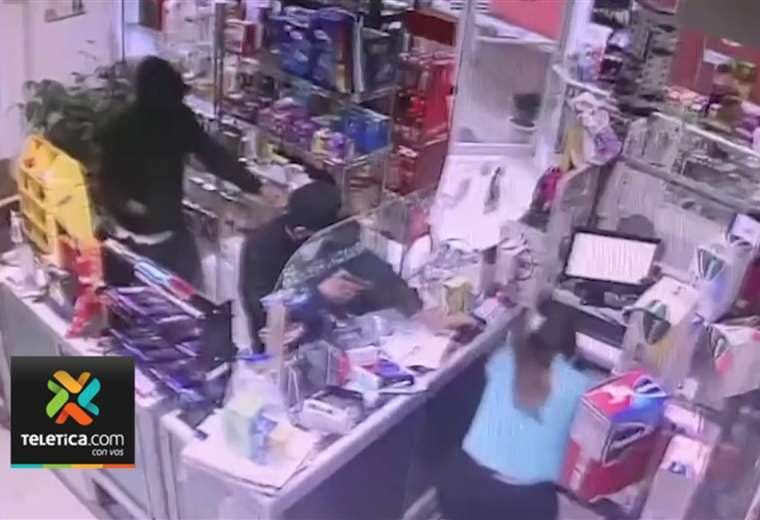 Dos sujetos armados asaltaron una farmacia en Carrillos Bajo de Poás en Alajuela y forcejearon con una mujer que tenía a una niña en brazos.
