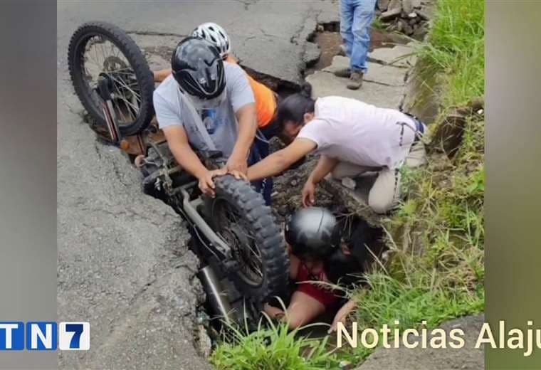 Video: Motociclista y acompañante caen a enorme hueco en Alajuela