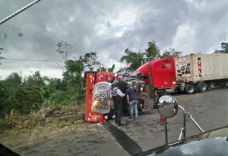 Sin embargo, el conductor del segundo tráiler no se detuvo y al sacar al primero furgón, siguió jalando hasta que volcó la grúa.