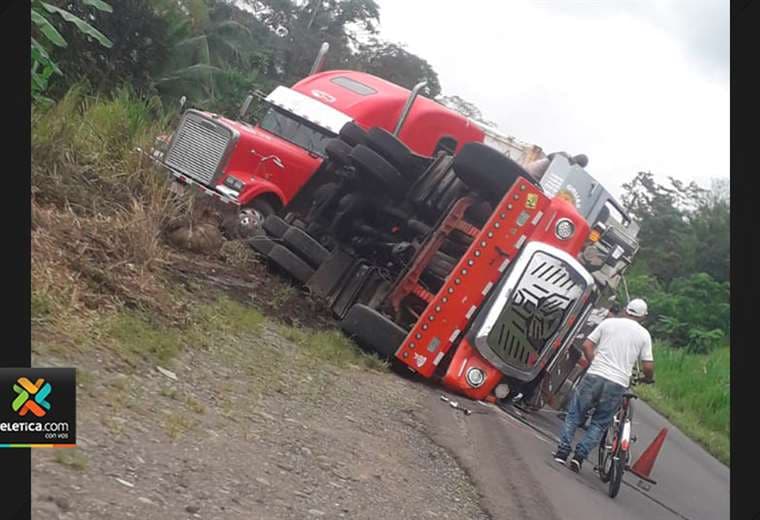 Según informaron camioneros a Teletica.com, los afectados optan por pedirle ayuda a otro furgón que iba pasando, por lo que amarran con cadenas los dos camiones pesados.