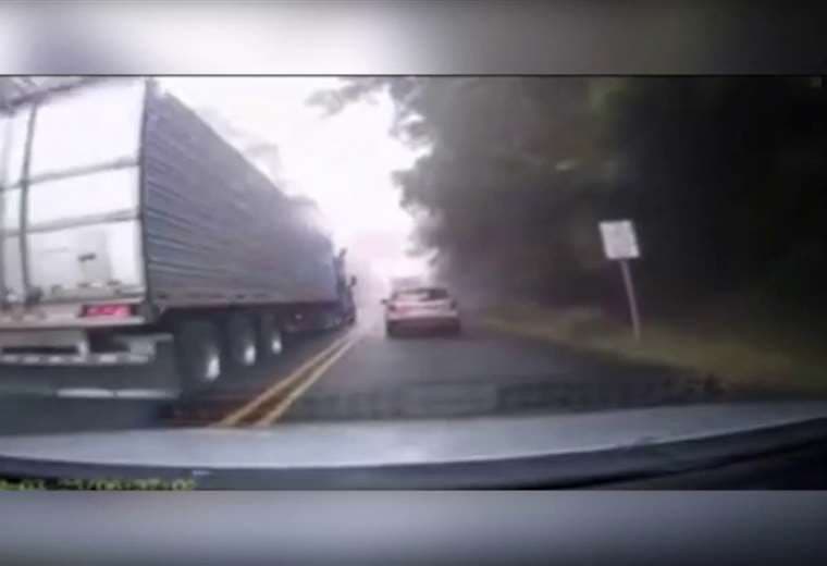 La dashcam de un vehículo grabó el instante cuando el conductor de un vehículo pesado provoca un accidente y luego se da a la fuga tras realizar un adelantamiento en doble línea amarilla, con la calle húmeda y con neblina.