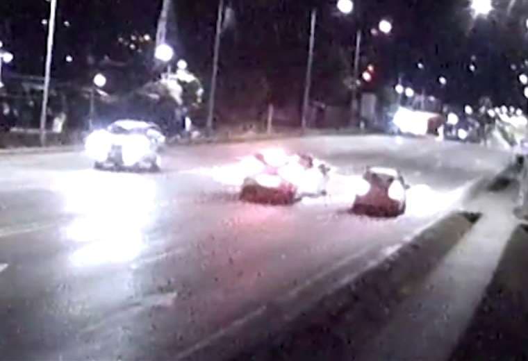 El choque fue captado por cámaras de vigilancia y en las imágenes se observa cómo dos vehículos circulan a gran velocidad cuando uno impacta por detrás al otro, provocando que se vuelque e impacte al tercer automóvil que transitaba por el carril derecho (vea el video adjunto en la portada).