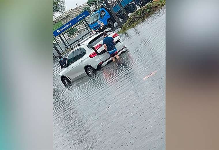Imágenes muestran como el nivel del agua llega a la mitad de vehículos que están estacionados y personas que deben detenerse ante la gran cantidad de agua en la carretera.