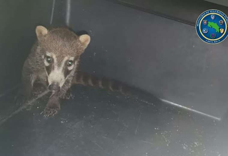 Policías de la Fuerza Pública, rescataron a una pequeña cría de pizote que estaba atrapada en una malla, por la que había intentado subir.